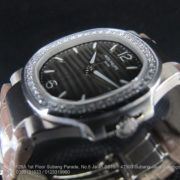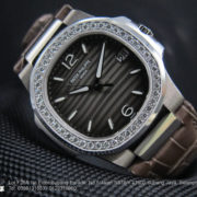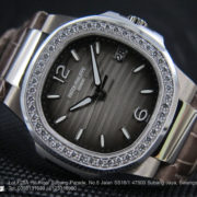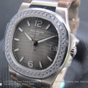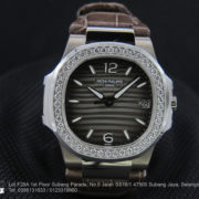 Nautilus – The sporting elegance watch. This is rounded octagonal shape of bezel with diamonds, case ingenious porthole construction and horizontally embossed dial. With luminous hands and index hour markers. Minute markers around the outer rim. Dial Type: Analog. Date display at the 3 o’clock position. Quartz movement. Scratch resistant sapphire crystal. Case diameter: 32 mm. Round case shape. Deployment clasp.