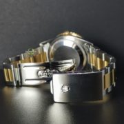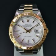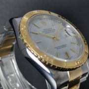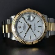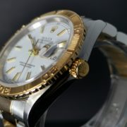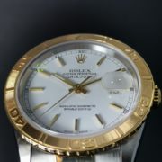 Rolex Datejust Turn-o-graph two tone white dial ref:16263. Officially certified chronometer self-winding movement. Stainless steel case 36 mm in diameter. Rolex logo on a 18K yellow gold crown. 18k yellow gold Thunderbird bidirectional rotating bezel. Scratch resistant sapphire crystal with cyclops magnifier. White dial with raised gold baton hour markers. Date window at 3 o’clock aperture. Stainless steel and 18k yellow gold oyster bracelet with fold over clasp.
